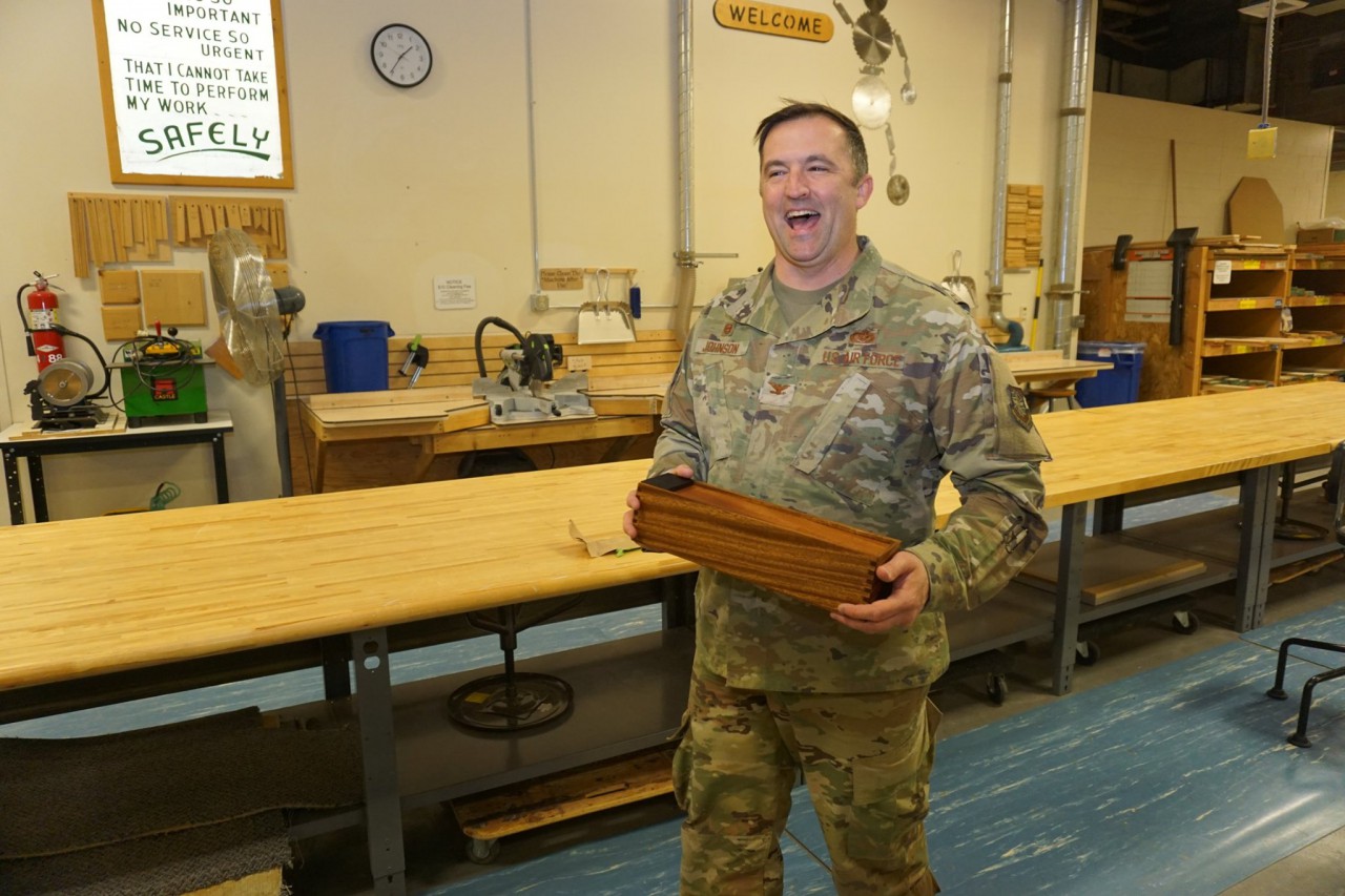 Colonel Johnson loved our state-of-the-art Wood Craft Center. He loved releasing an idea he had from the wood. As a goodbye gift, Kevin and his team, gave the Colonel a very personal gift for his retirement, his own stamp to brand is projects.